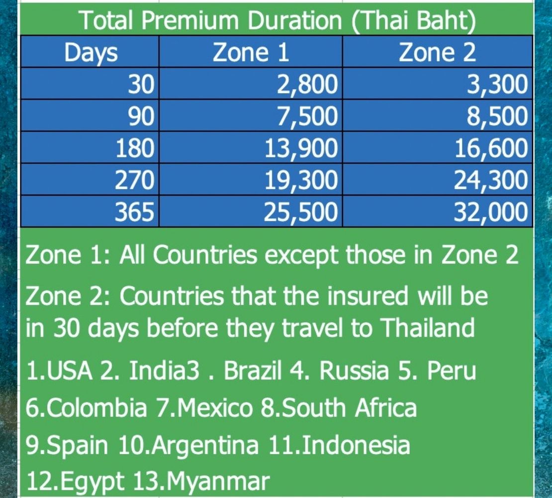 Eligible persons: o Non-Thai nationals, excluding those travelling to Thailand for medical treatment and those of sanctioned countries and related to anti money laundering/sanction regulations o Age: 1-74 years old Remark - High Risk Zone: Argentina, Brazil, Colombia, Egypt, India, Indonesia, Mexico, Myanmar, Peru, Russia, South Africa, Spain, USA - Low Risk Zone: all other countries except in high risk zone and sanctioned countries - This document is not insurance contract. Full details are specified in the insurance policy. For more details of coverage and exclusion in the insurance policy. - Sawasdee Thailand is the marketing name for Inbound Travel Accident Insurance. - Insurance sale offering by agent/brokers shall be in compliance with criteria specified by the company and Office of Insurance Commission. - Full premium refund if insurance is rejected by Thai Embassy / Consulate |