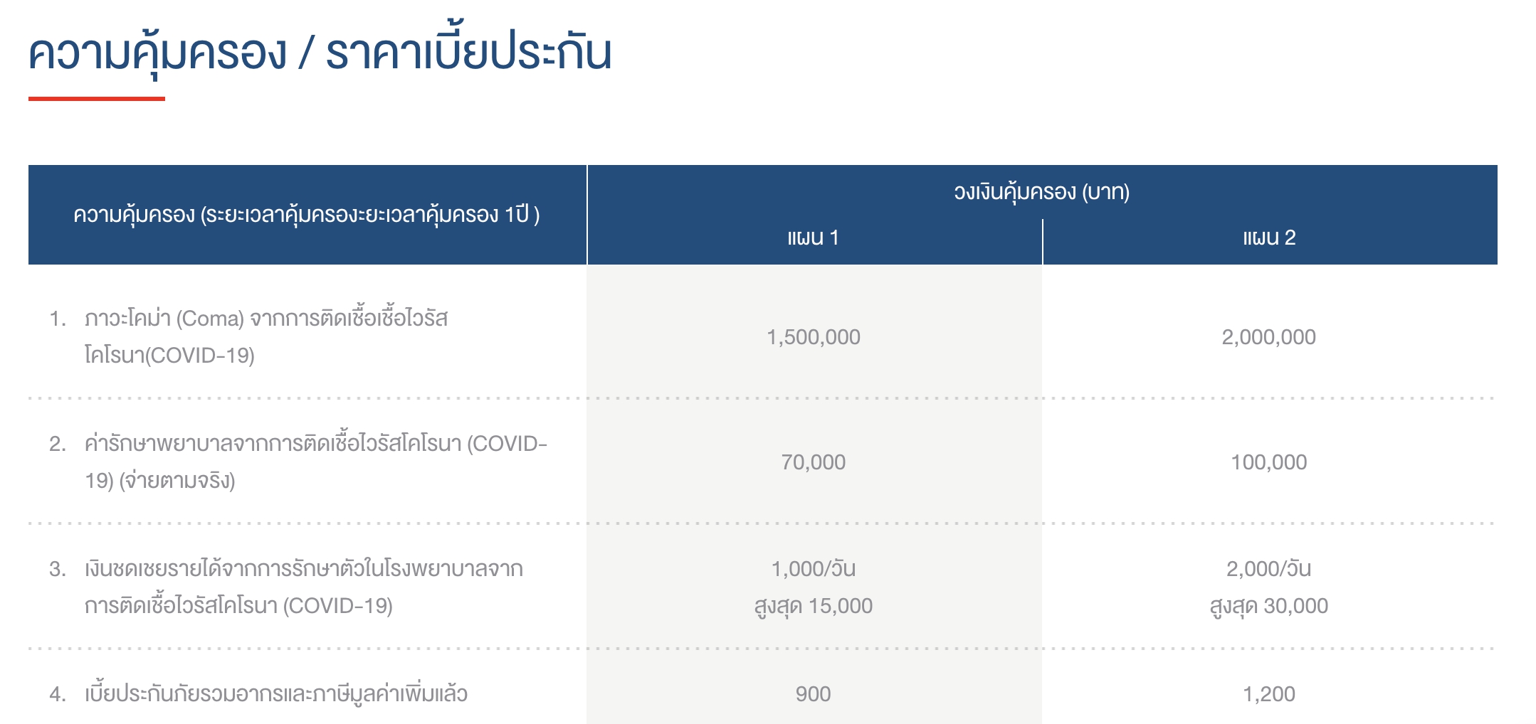 ตารางความคุ้มครอง แผนอุ่นใจ และ ราคาเบี้ยประกัน