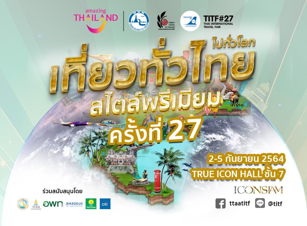 งานแฟร์ ท่องเที่ยวเดือน กันยายน 2564 ของสมาคมไทยบริการท่องเที่ยว (ทีทีเอเอ) TTAA พบกันที่ ทรู ไอคอน ฮอลล์ ชั้น 7 ไอคอนสยาม ในงาน TITF ครั้งที่ 27 เที่ยวทั่วไทย สไตล์พรีเมียม งานจัดระหว่างวันที่ 2-5 กันยายน 2564 พบกับแพคเกจ ทัวร์ ในประเทศ ของผู้ประกอบการท่องเที่ยวในไทย และ องค์การส่งเสริมการท่องเที่ยว ของต่างประเทศ ในงานนี้ด้วย