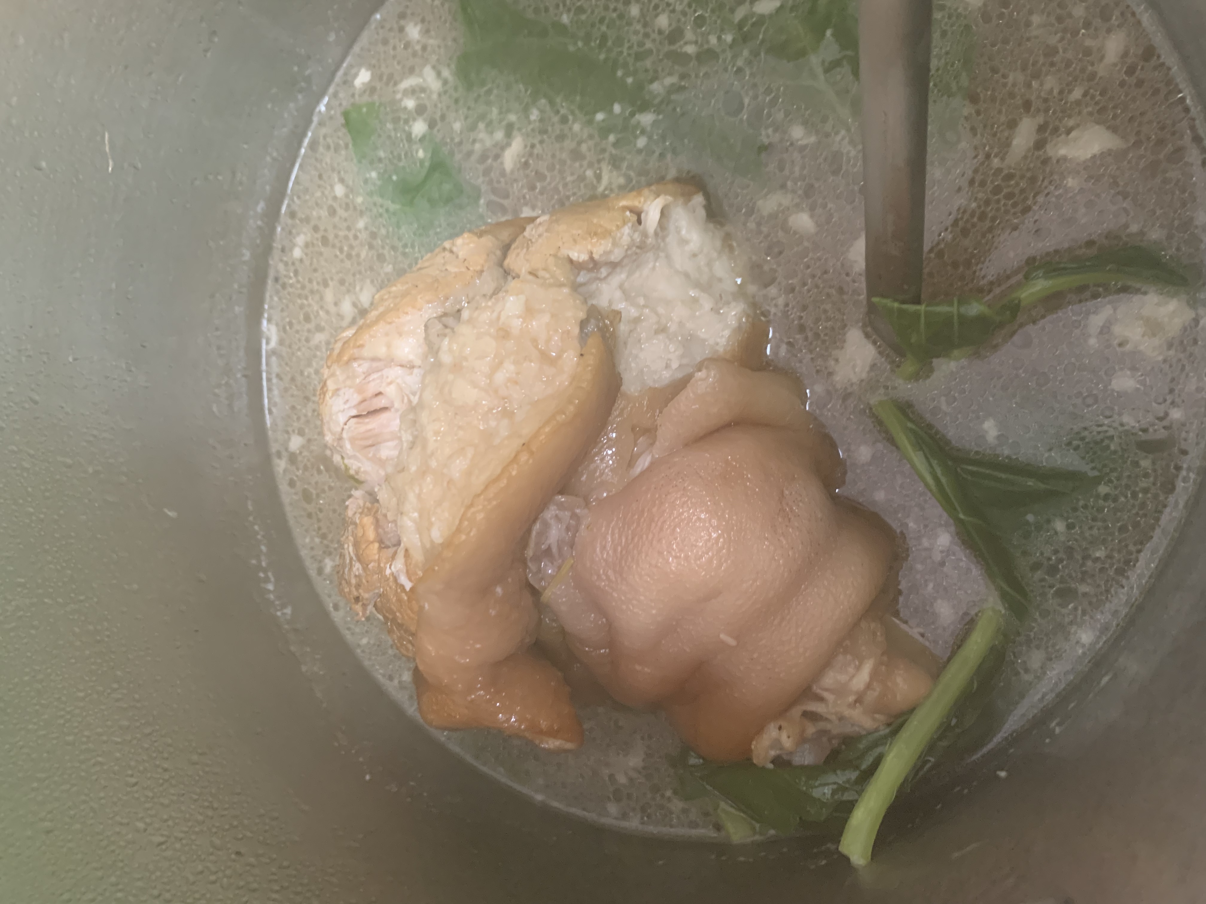 ข้างบนพิมพ์ผิดไป 2 คำขออภัยด้วยครับ รถมาส่งช่วงบ่ายๆแล้ว เลยใส่ถุงของเราซ้อนอีกชั้น เก็บเข้าช่องแข็ง เช้ามาจัดเลย ขาหมูพะโล้ เราทำรสชาติแบบไม่หวาน จะได้ซดน้ำแบบไลท์ๆ ด้วย เริ่มที่เอาขาหมูแสนจะใหญ่โต มาทอดน้ำมันให้หนังตึง เสร็จแล้วเอาลงใส่หม้อต้มในน้ำเดือด ซึงมีรากผักชีรอไว้แล้ว ต่อไปเราโขลก รากผักชี พริกไทย กระเทียม เอาไปเจียวน้ำมัน เติมน้ำ และเครื่องปรุง ซึ่งเราใช้ ซีอิ๊วขาวแต่สีดำ ซีอิ๊วดำหวาน น้ำมีนหอยนิดหน่อย น้ำตาลปี๊ปอีกนิดหน่อย เคี่ยวให้หอม แล้วเอาลงหม้อต้มเลย