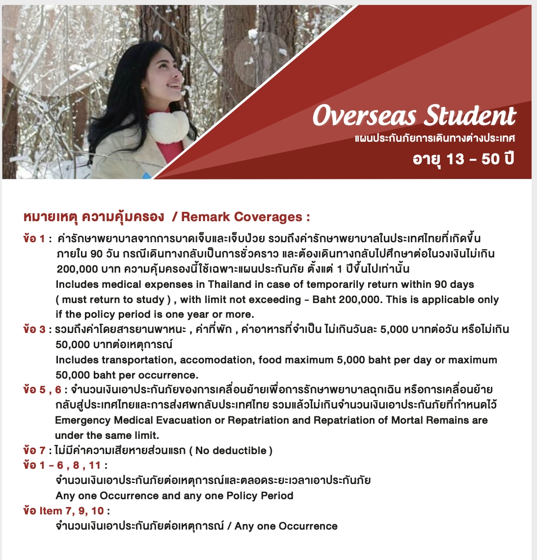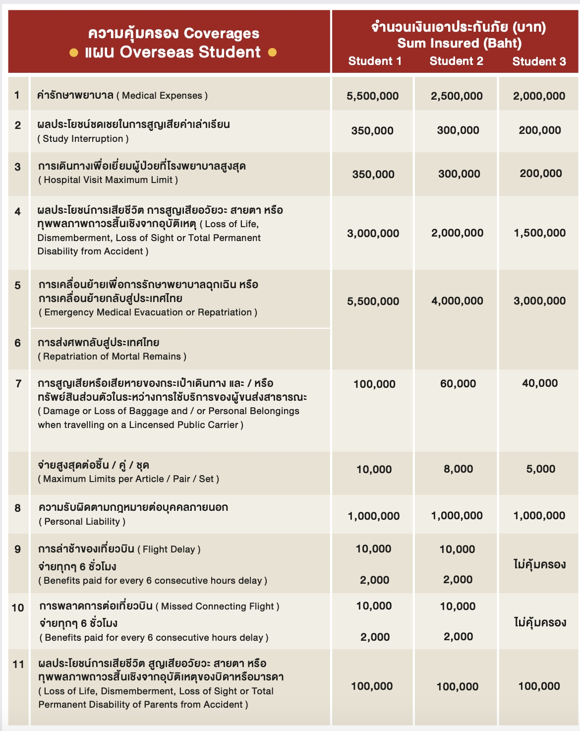 ให้ความคุ้มครอง ชดเชยการสูญเสีย ค่าเล่าเรียน คุ้มครองการเจ็บป่วย และ อุบัติเหตุ ที่สำคัญคุ้มครองการเจ็บป่วยอันเนื่องมาจากการติดเชื้อ โควิด-19 ในต่างประเทศ