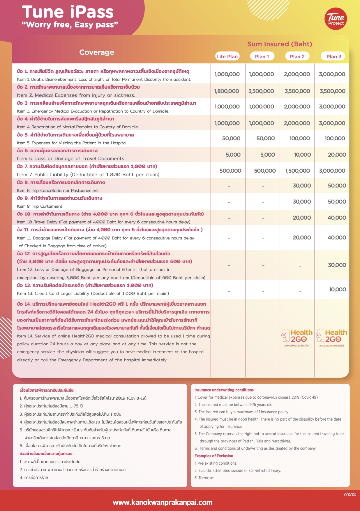 Insurance plans for foreigners entering Thailand The minimum coverage amount is $50,000 and $100,000. แผนประกันต่างชาติเข้าไทย วงเงินคุ้มครองขั้นต่ำ 50,000 เหรียญ และ 100,000 เหรียญ ดอลล่าร์สหรัฐ