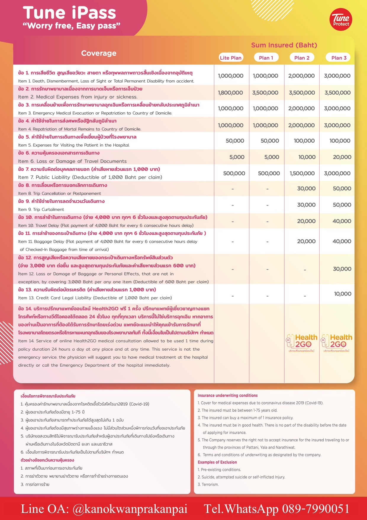 Contact us for insurance minimum USD50,000 entering Thailand Line OA: @kanokwanprakanpai Tel.whatsapp 0897990051 Email: kanokwanprakanpai@gmail.com