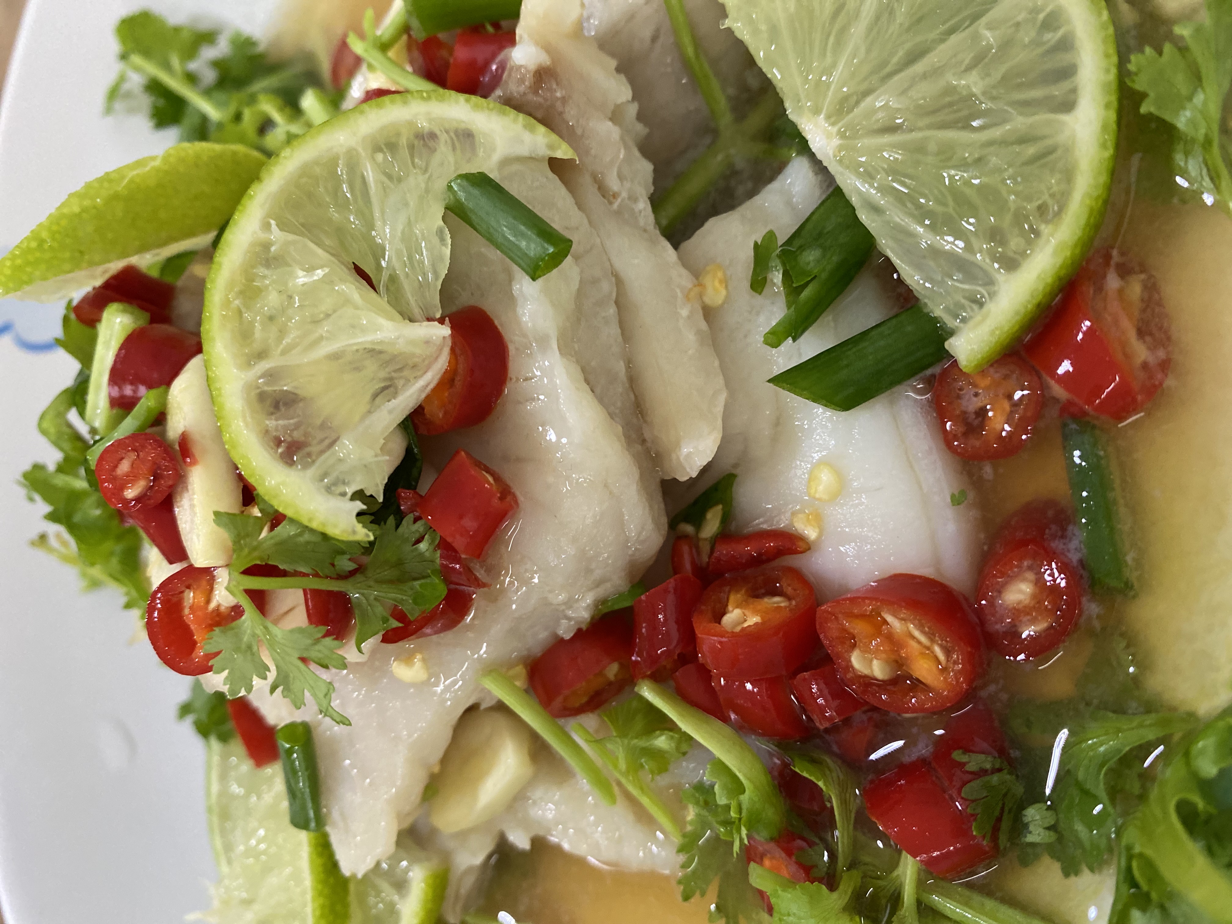 นำปลาแช่แข็ง ออกมาละลายน้ำแข็ง จัดน้ำยำมี น้ำตาลทราย น้ำปลา พริกขี้หนูสด แล้วก็มะนาว มีแค่นี้ ทีนี้เวลายำเนี่ย ตะก่อนก็สงสัยว่า ทำไมไม่บอกไปเลยว่า ใส่อะไรกี่ช้อน ก็มาถึงบางอ้อ คำว่า ปรุงรสตามชอบ นั่นหมายความว่า ต้องชิมก่อน ชอบเค็มก็น้ำปลาเยอะหน่อย ชอบเปรี้ยวก็มะนาวหนักๆ อันนี้ปรุงเองตามชอบ นึ่งปลาให้สุกแล้วมาราดน้ำยำ จัดหน้าตาด้วยต้นหอม ผักชี มะนาวหั่น อร่อยเหาะ