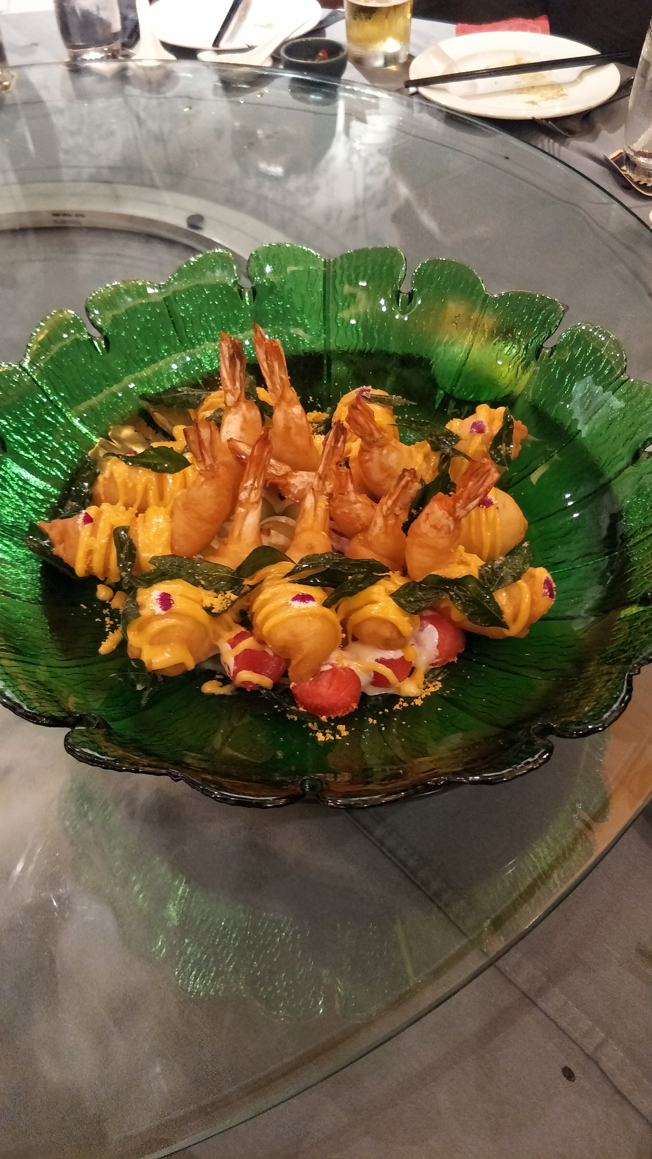 สลัดกุ้งทอด ราดซอสไข่เค็ม