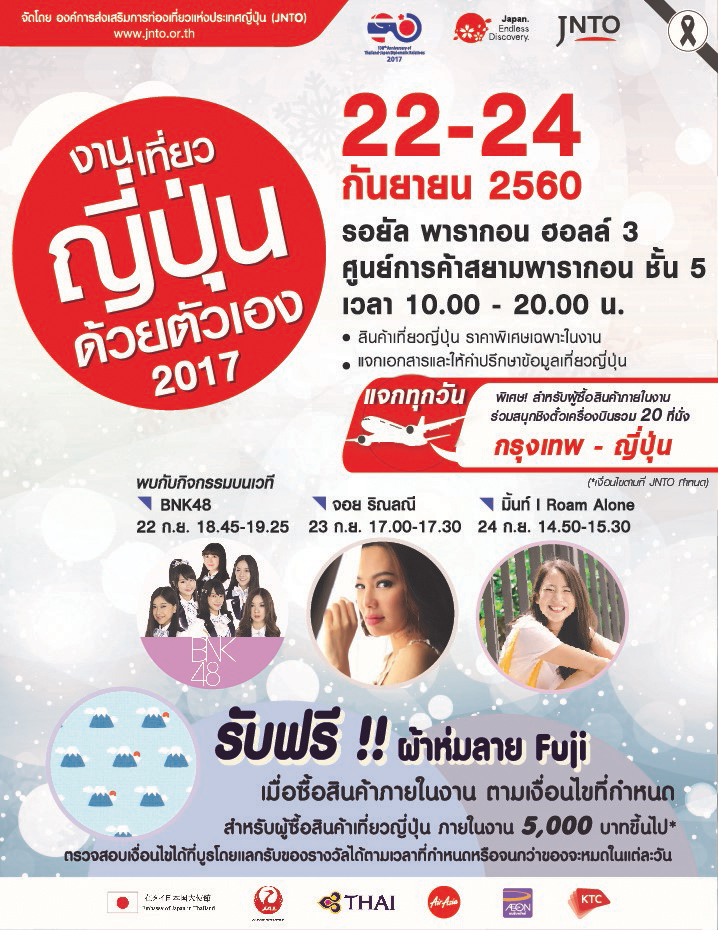 ภายในงานพบกับกิจกรรมที่เตรียมไว้สำหรับผู้สนใจเดินทางท่องเที่ยวประเทศญี่ปุ่น ได้แก่ - การจำหน่ายแพ็คเกจเที่ยวอิสระ ตั๋วเครื่องบิน ที่พัก บัตรรถไฟ Japan Rail Pass ซึ่งเป็นบัตรรถไฟแบบเหมาจ่ายใบเดียวขึ้นรถไฟ Japan Railway ได้ทั่วญี่ปุ่น บัตรรถไฟเหมาจ่ายแบบรายภูมิภาค บัตรเข้าสวนสนุก และบัตรสุดคุ้มอื่นๆ ในราคาพิเศษ รวมทั้งจำหน่ายสินค้าทัวร์ไปญี่ปุ่นอีกด้วย ทั้งนี้เป็นการออกบูธโดยผู้ประกอบการท่องเที่ยวทั้งจากญี่ปุ่นและจากไทย เช่น บริษัททัวร์ชั้นนำ โรงแรม และสายการบิน รวมทั้งสิ้นมากกว่า 100 บูธ - การแจกเอกสารและการให้คำปรึกษาเกี่ยวกับการท่องเที่ยวประเทศญี่ปุ่นที่บูธของ JNTO และที่บูธจากจังหวัดต่างๆในญี่ปุ่นที่มาเข้าร่วมงานโดยไม่มีค่าใช้จ่าย (มีล่ามคอยให้บริการ) - พิเศษ! สำหรับผู้ซื้อสินค้าเที่ยวญี่ปุ่นกับสายการบินหรือบริษัททัวร์ภายในงานมูลค่าเท่ากับหรือมากกว่า 5,000 บาทต่อใบเสร็จตามเงื่อนไขที่กำหนด นำกระดาษใบเสร็จมาแสดงเพื่อแลกรับฟรีของที่ระลึก ผ้าคลุมลายภูเขาไฟฟูจิ ขนาด 30 x 40 นิ้ว (จำนวนจำกัดต่อวัน) และยังได้รับสิทธิ์ร่วมกิจกรรมจับฉลากหาผู้โชคดีลุ้นรับบัตรโดยสารเครื่องบินไปกลับ กรุงเทพฯ-ญี่ปุ่น รวมทั้งสิ้น 10 รางวัล 20 ที่นั่ง * โดยทุกๆ 5,000 บาท สามารถแลกรับผ้าคลุมลายภูเขาไฟฟูจิได้ 1 ชิ้น และได้รับสิทธิ์ร่วมกิจกรรมจับฉลาก 1 สิทธิ์ (สูงสุดไม่เกินจำนวนผู้เดินทางที่ระบุในใบเสร็จ) ** กระดาษใบเสร็จรับเงินที่นำมาแสดงหากมีหลายใบและเป็นการเดินทางในทริปเดียวกัน ขอสงวนสิทธิ์ในการแลกรับของที่ระลึกได้เพียง 1 ชิ้นต่อผู้เดินทาง 1 ท่าน *** ของที่ระลึกมีจำนวนจำกัดต่อวัน แลกรับได้ภายในวันที่ซื้อสินค้าที่ระบุบนใบเสร็จ ได้ถึงเวลา 19.30 น. หรือจนกว่าของหมดในแต่ละวัน **** ผู้ได้รับรางวัลบัตรโดยสารเครื่องบินต้องเป็นผู้รับผิดชอบภาษีหัก ณ ที่จ่าย 5% รวมทั้งค่าใช้จ่ายและภาษีอื่นๆ / ผู้ได้รับรางวัลมีหน้าที่นำมูลค่าของรางวัลยื่นคำนวณเป็นเงินได้เพื่อจ่ายภาษีประจำปี ***** กฎกติกาการแลกของที่ระลึก และการร่วมกิจกรรมจับฉลากหาผู้โชคดีลุ้นรับบัตรโดยสารเครื่องบินอาจมีการเปลี่ยนแปลง กรุณาตรวจสอบกฎกติกาและรายละเอียดเงื่อนไขต่างๆได้ที่บูธแลกของที่ระลึก (บริเวณฮอลล์ 1 ภายในงาน) สิทธินี้สำหรับลูกค้าสัญชาติไทยเท่านั้น ศิลปินชื่อดังแสดงมินิคอนเสิร์ต / ร่วมพูดคุยถึงประสบการณ์ในการเดินทางท่องเที่ยวประเทศญี่ปุ่น บนเวทีภายในงาน BNK48 วงศิลปินไอดอลไทย ศุกร์ที่ 22 กันยายน 2017 เวลา 18:45-19:25 น. คุณจอย รินลณี พิธีกรรายการ เปรี้ยวปาก-เช็คอิน เสาร์ที่ 23 กันยายน 2017 เวลา 17:0