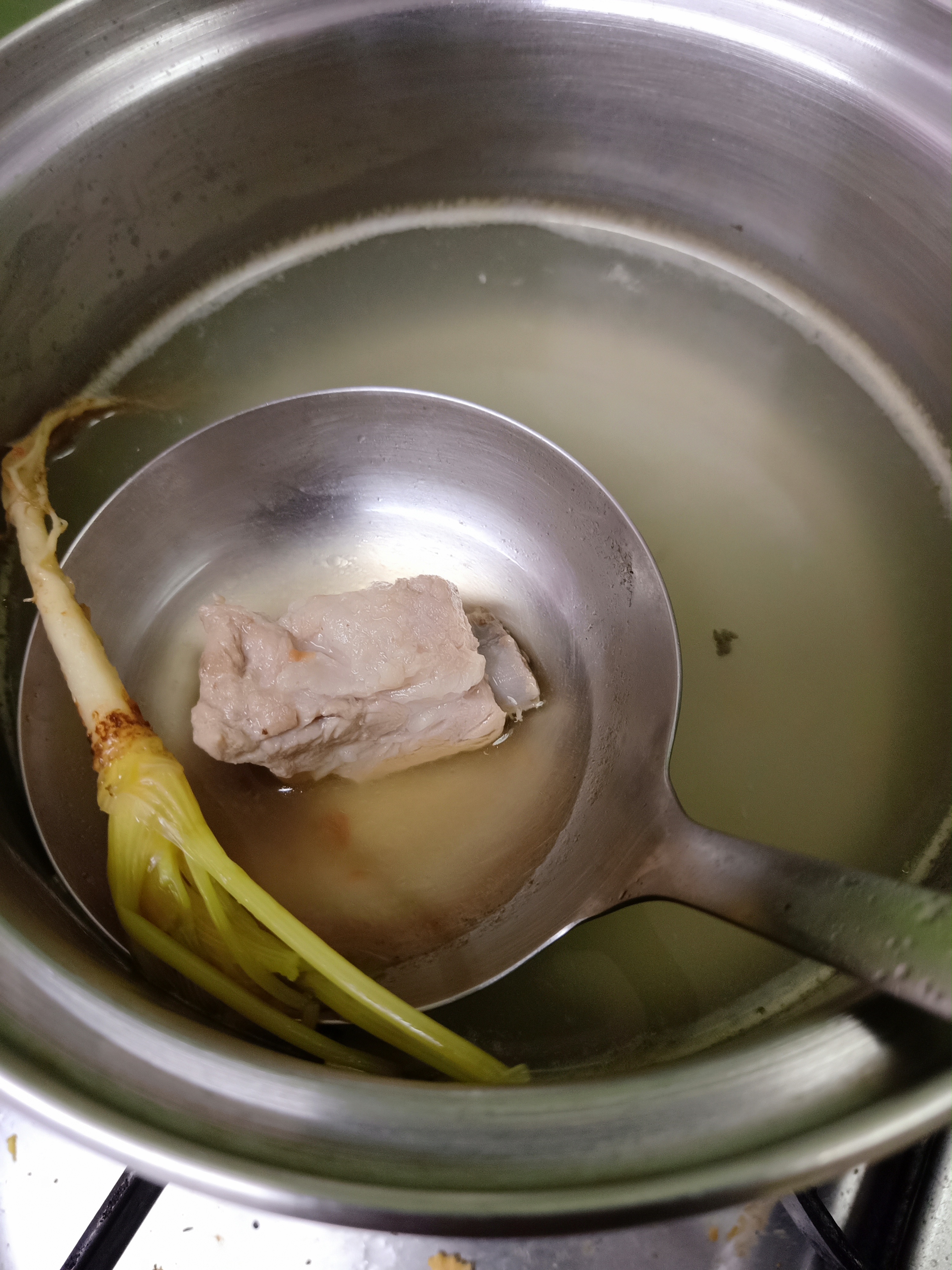สำหรับการเตรียมน้ำซุป ต้มน้ำเปล่า แล้วแต่ว่าทำมากน้อย ใส่กระดูกหมูหั่น ใส่รากผักชี 3 ราก ต้มไปจนสุก ถ้าชอบเนื้อติดกระดูกเปื่อยก็ต้มไปสัก 1 ชม
