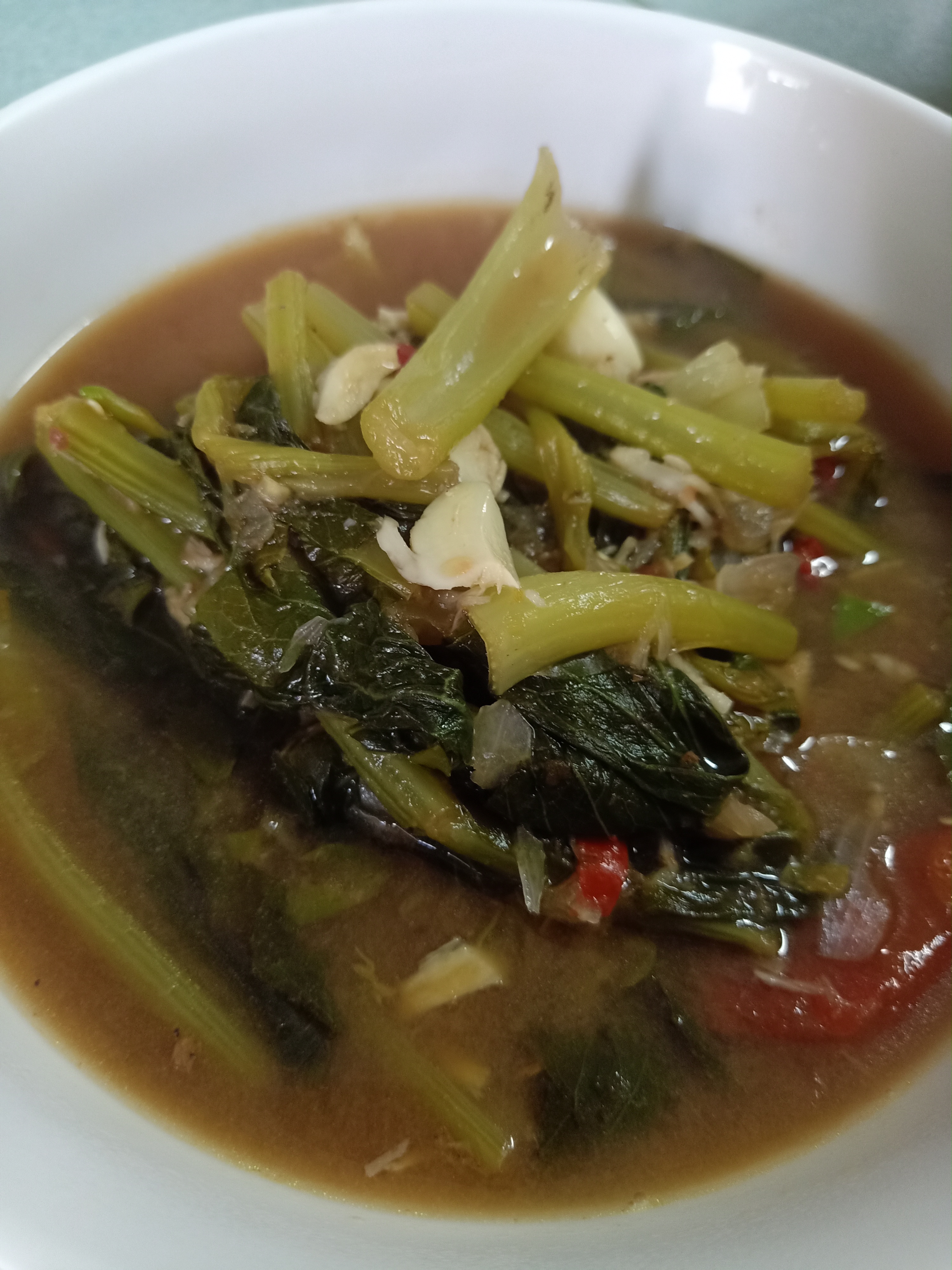 กะปิ ตัวนี้เด็ดเลย บางท่านใช่ถั่วเน่า บางท่านใช้น้ำปลาร้า เอาตามที่เรามี และเราชอบครับ ตักมาเยอะหน่อย ใส่ถ้วยเติมน้ำคนให้ละลาย ใส่พริก มะเขือพวง เฮ้ย นั่นมันน้ำพริกกะปิ ล้อเล่นนา คนกะปิละลายใส่ถ้วยรอ ถ้าไม่คนละลายไว้ก่อน ตักใส่หม้อเลย จะปรุงรสลำบาก เพราะกะปิละลายไม่หมด