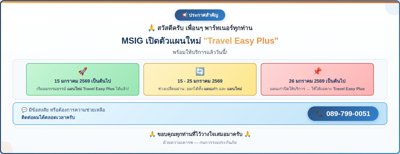 สวัสดีคะ เราเป็นนายหน้า ประกันวินาศภัย อย่างถูกต้อง ตามกฏหมาย เป็นสมาชิก TTAA no. E228 บริการของเราเน้นเรื่องการให้บริการที่สามารถติดต่อง่าย มีช่องทางให้ติดต่อเราได้หลากหลายช่องทาง ไม่ว่าจะเป็น ลาย เฟสบุค อีเมล์ เว็บไซต์ หรือ โทรศัพท์ เว็บไซต์ของเราให้บริการด้านข้อมูล ความรู้ที่เกี่ยวข้องกับประกันวินาศภัย รวมถึงการออกกรมธรรม์ออนไลน์ ของประกันเดินทาง ท่านสามารถส่งข้อมูลที่ต้องการสอบถาม ผ่านระบบของเราดังที่ได้กล่าวมาแล้ว หวังว่าบริการต่างๆที่เรามี จะตอบโจทย์ความต้องการของทุกท่านได้อย่างรวดเร็วและสะดวกสบายนะคะ ขอบคุณคะ